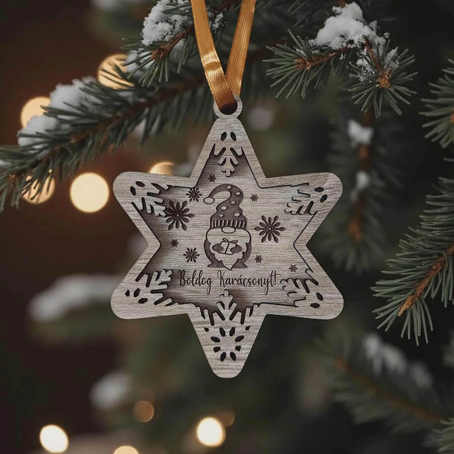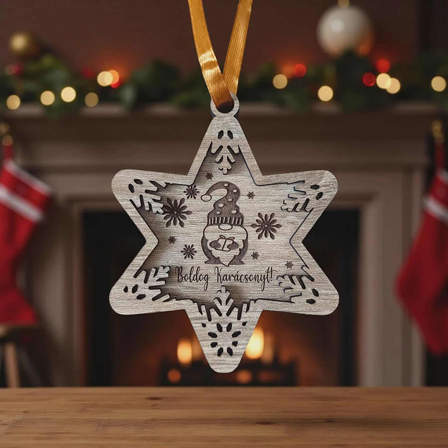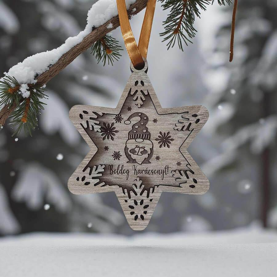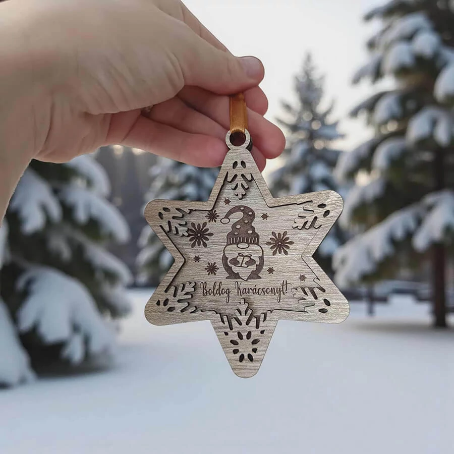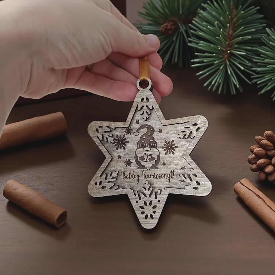 A dísz csillag formájú, 8,5 x 11 cm-es méretben, amely ideális a karácsonyfára vagy akár az ajtódísz mellé is. A finom lézergravírozás manó- és hópehely-mintákkal díszíti a felületet, a közepén pedig elegáns "Boldog Karácsonyt" felirat kapott helyet. Ez a részletgazdag megmunkálás garantálja, hogy minden darab egyedi és megismételhetetlen legyen – akárcsak az ünnep hangulata.