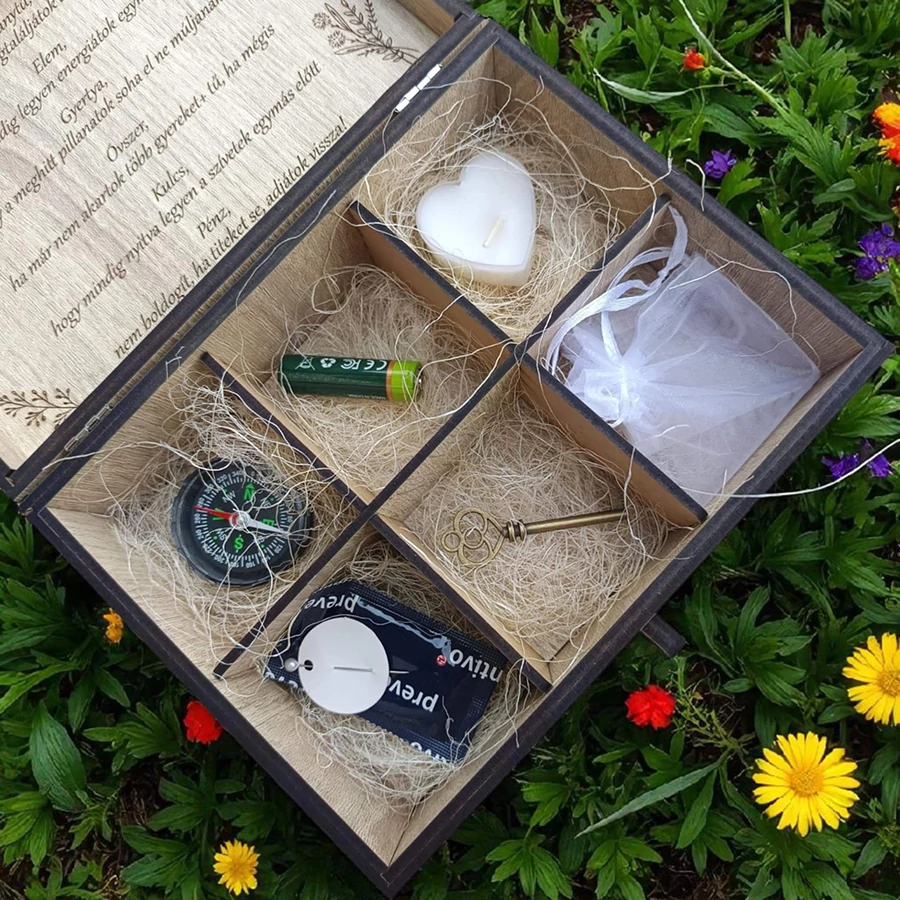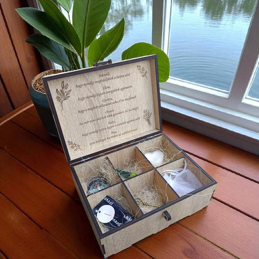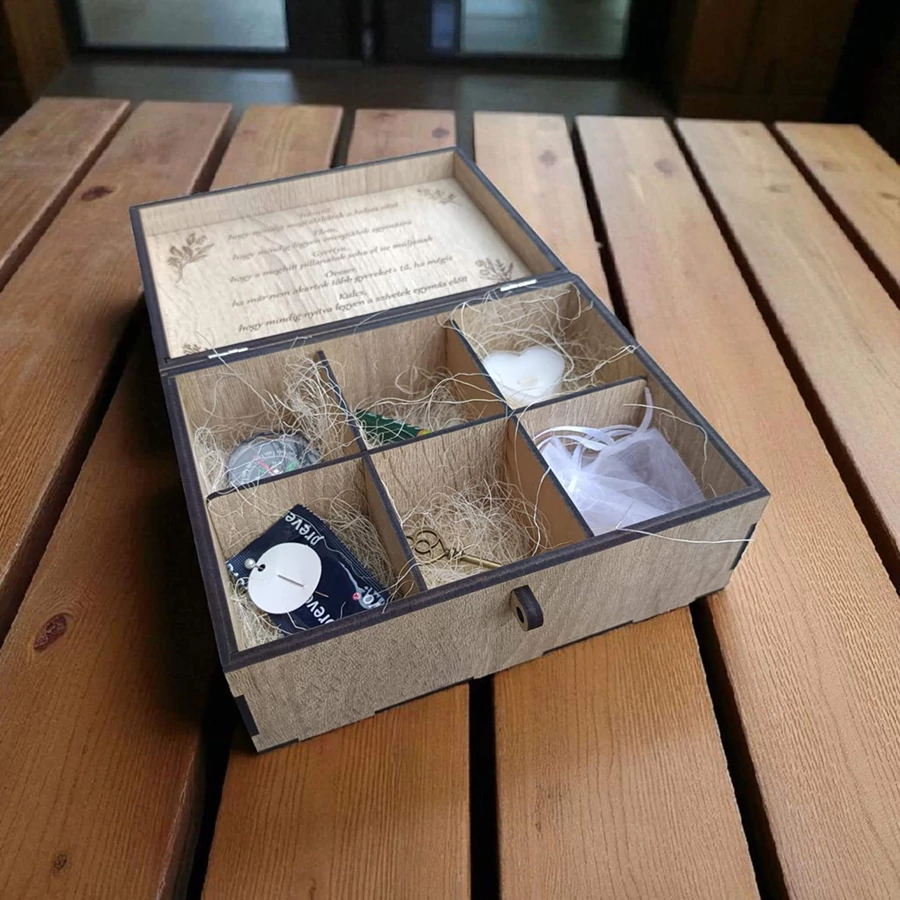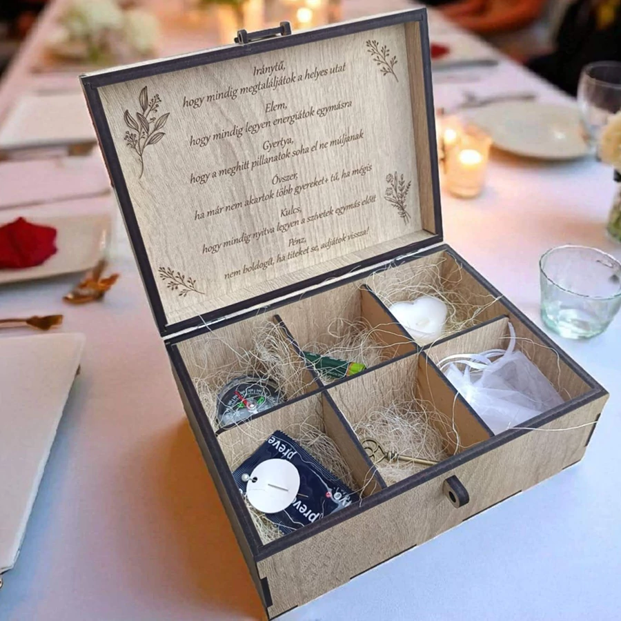 A rekeszes gravírozott ajándékdoboz esküvőre tökéletes választás, ha valami igazán emlékezetessel szeretnéd meglepni az ifjú párt. Nem egy szokványos tárgy, hanem egy kreatív és szimbolikus ajándék, amely mindig mosolyt csal az arcokra. Az egyedi gravírozásnak köszönhetően teljesen személyre szabható, így garantáltan nem lesz két egyforma darab.