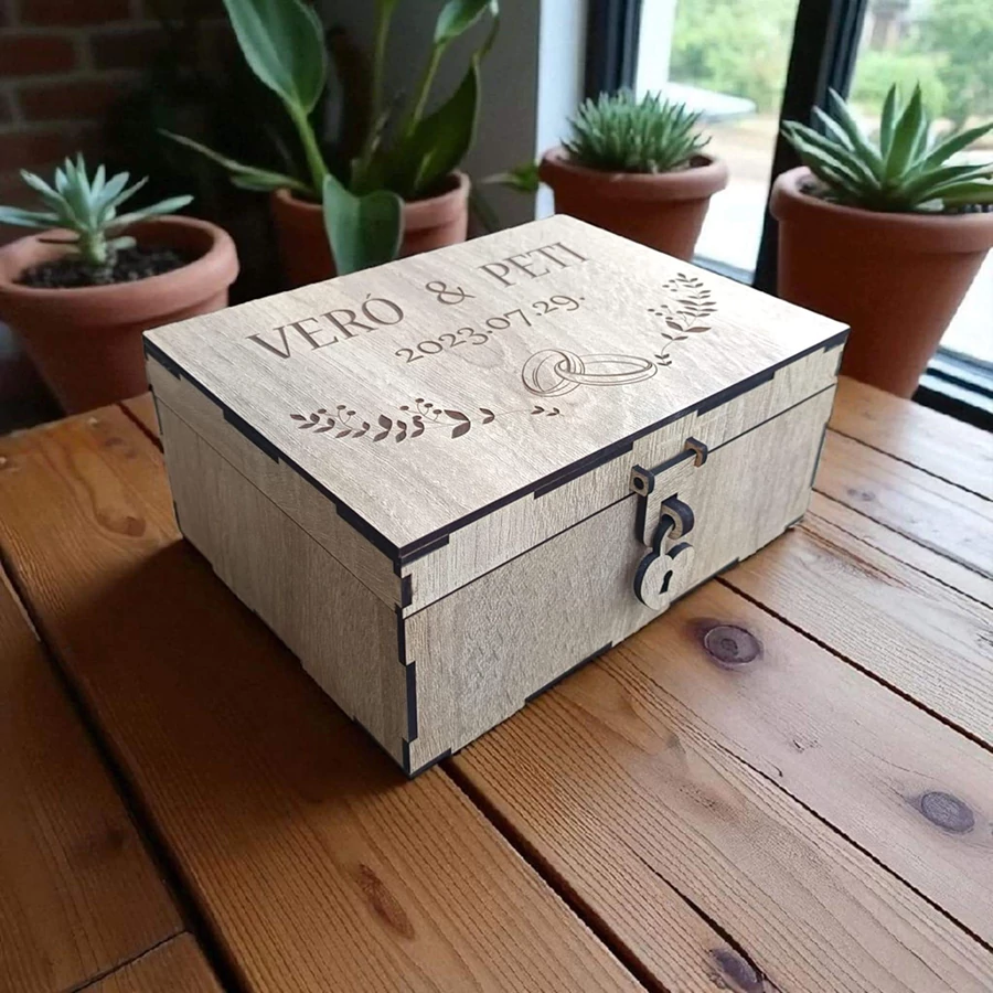 A nászajándék gravírozott doboz MDF anyagból készül, 20 x 15 x 8,5 cm-es méretben. A fedelét egyedi gravírozással teheted igazán különlegessé: a pár neve és az esküvő dátuma kerül rá, meseszép gyűrű- és virágmintákkal díszítve. A belső részt szintén gravírozott virág motívumok és idézetek ékesítik, így a doboz minden apró részlete személyes és emlékezetes. Ez a fajta ajándék garantáltan örök emlék marad, hiszen a pár mindig vissza tudja idézni a nagy nap megható és humoros pillanatait.