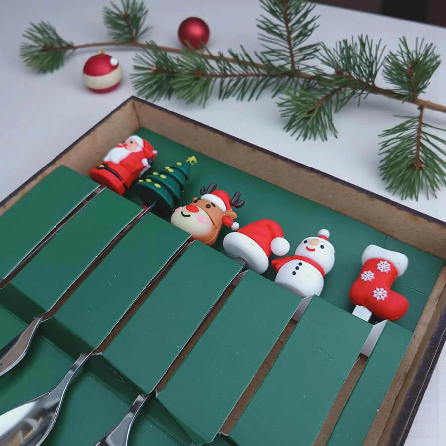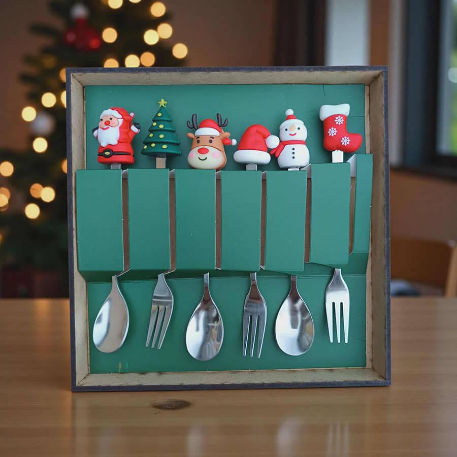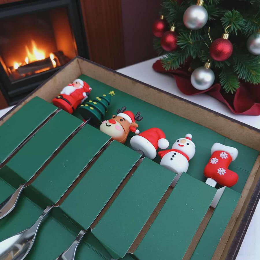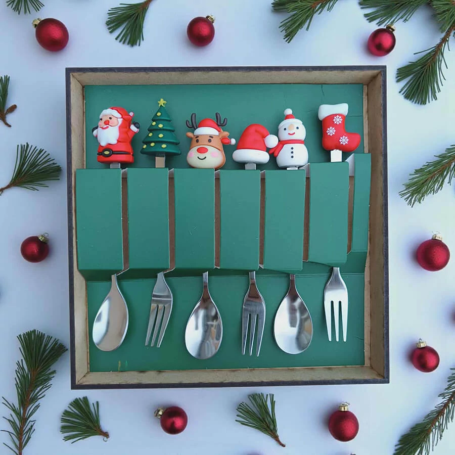 A szett 3 darab kanalat és 3 darab villát tartalmaz, melyek mindegyike egy-egy kedves karácsonyi motívummal díszített: