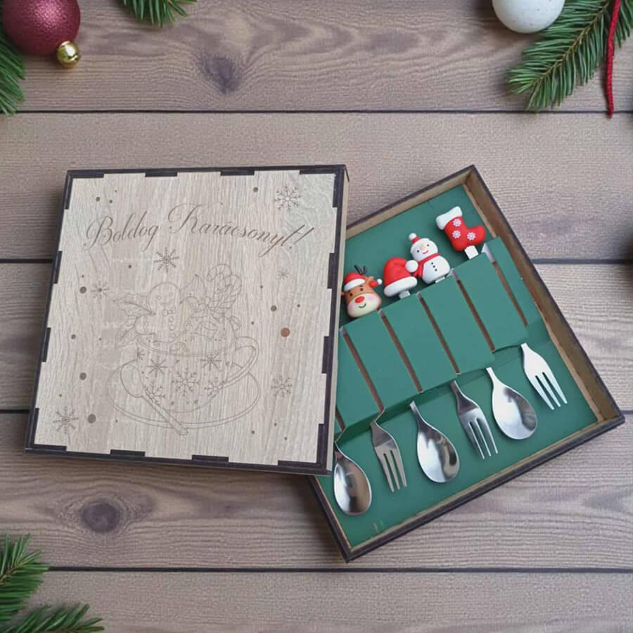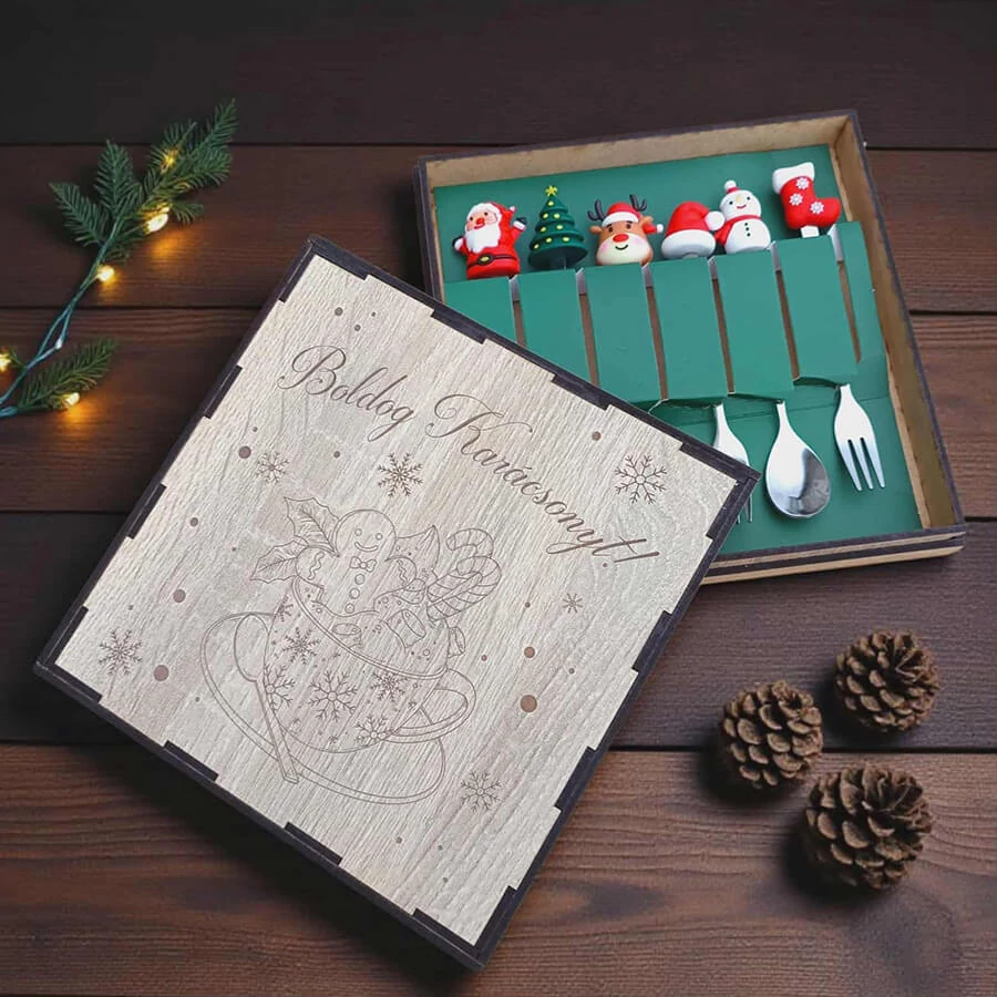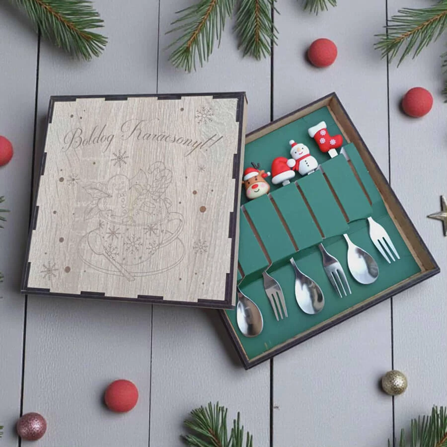 Az evőeszközök praktikusak, mégis vidám, ünnepi hangulatot teremtenek, így garantáltan mosolyt csalnak mindenki arcára az asztalnál. Az MDF doboz nemcsak tárolásra alkalmas, hanem ajándékcsomagolásként is elegáns megoldás.
