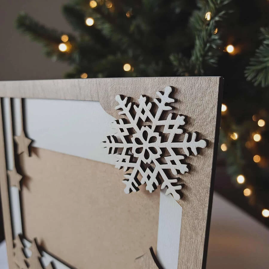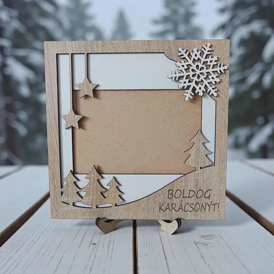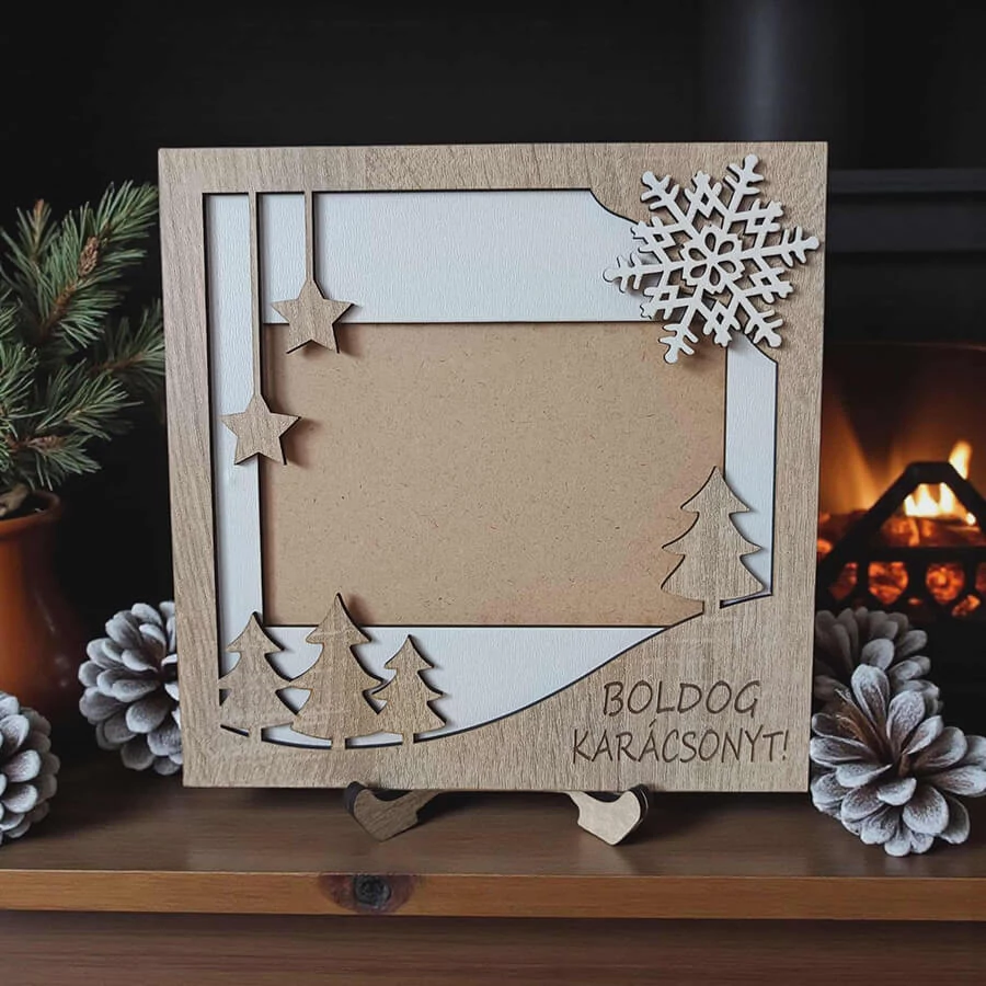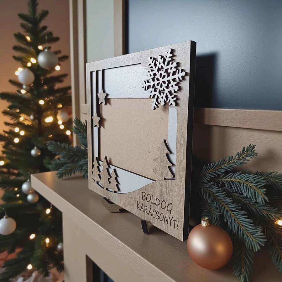 Ez a különleges képkeret nemcsak funkcionális, hanem látványos karácsonyi dekoráció is. A keret felső részét lézervágott motívumok – hópehely, csillag és fenyőfa – díszítik, míg alul egy finoman gravírozott "Boldog Karácsonyt" felirat teszi teljessé az ünnepi megjelenést. Minden egyes darab gondos kidolgozással készül, így garantáltan örömet szerez annak, aki kapja.