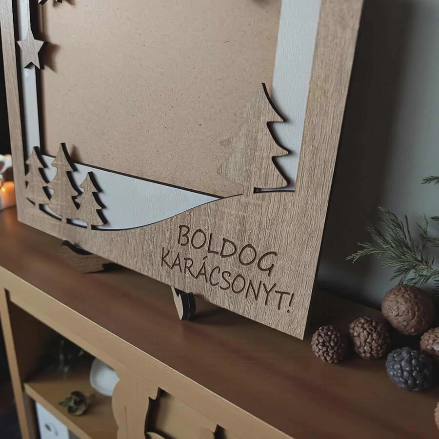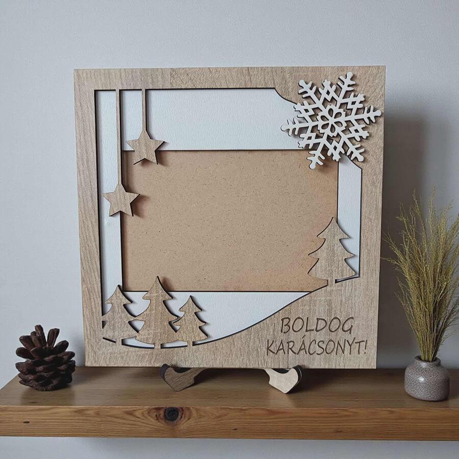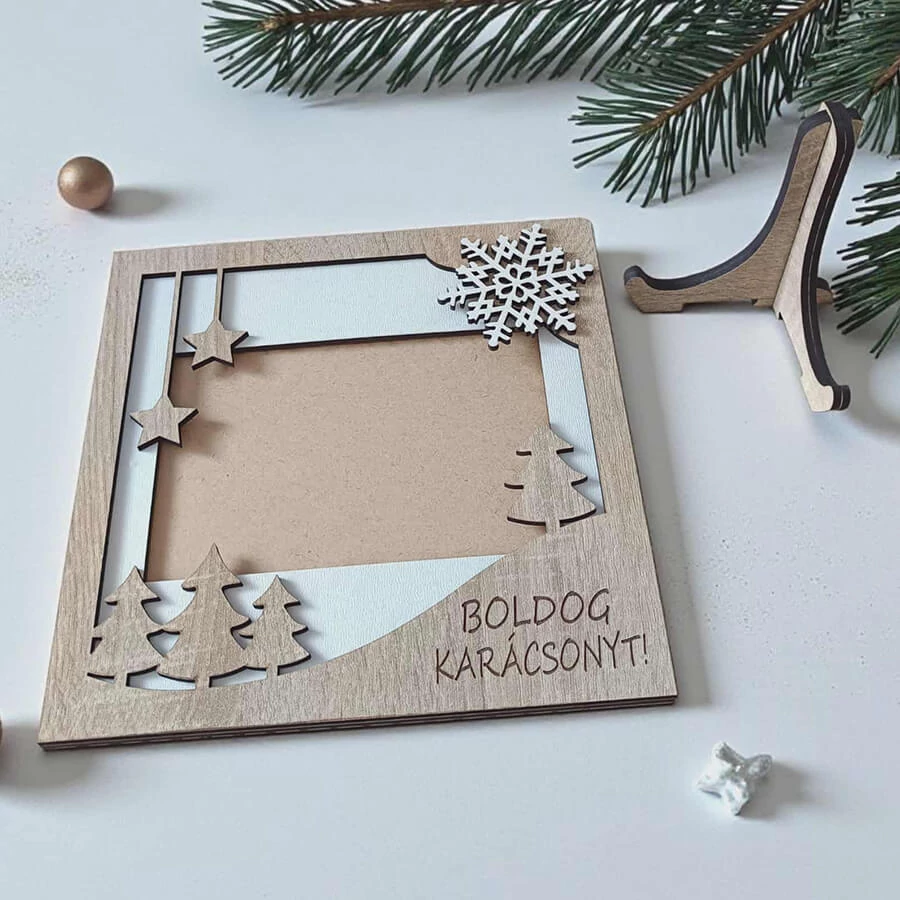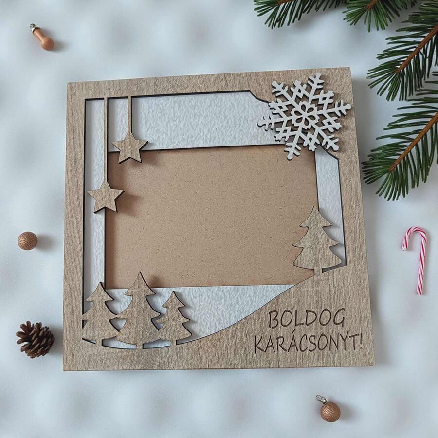 Ez a különleges képkeret nemcsak funkcionális, hanem látványos karácsonyi dekoráció is. A keret felső részét lézervágott motívumok – hópehely, csillag és fenyőfa – díszítik, míg alul egy finoman gravírozott "Boldog Karácsonyt" felirat teszi teljessé az ünnepi megjelenést. Minden egyes darab gondos kidolgozással készül, így garantáltan örömet szerez annak, aki kapja.